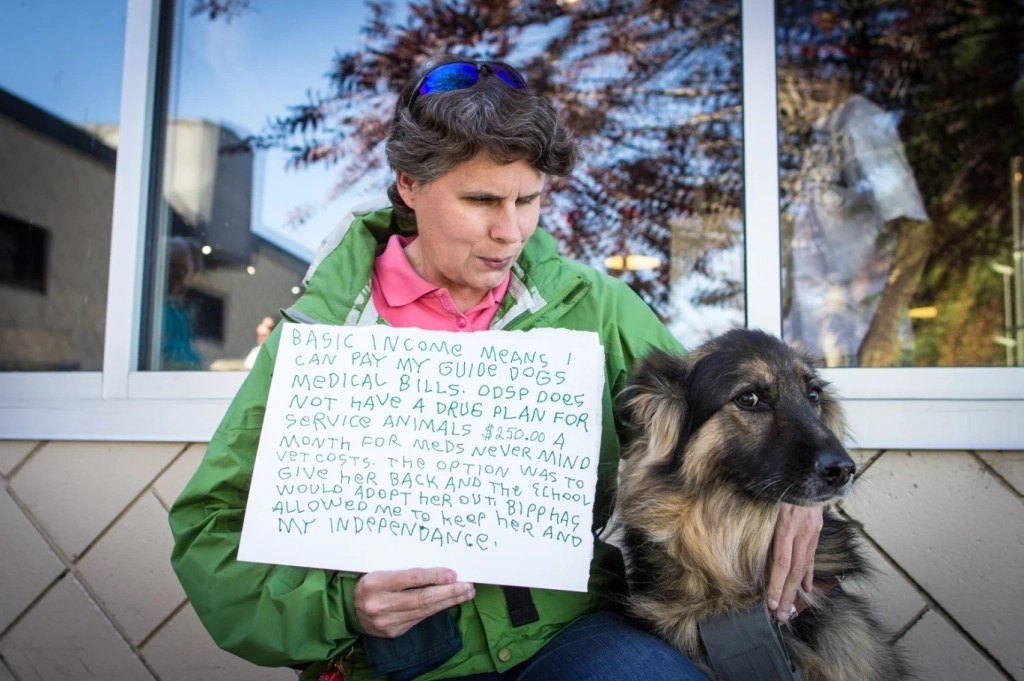 “Basic Income means I can pay my guide dog’s medical bills. ODSP does not have a drug plan for service animals – $250 a month for medications – never mind vet costs. The option was to give her back and the school would adopt her but BIPP (Basic Income Pilot Project) has allowed me to keep her and my independence.”